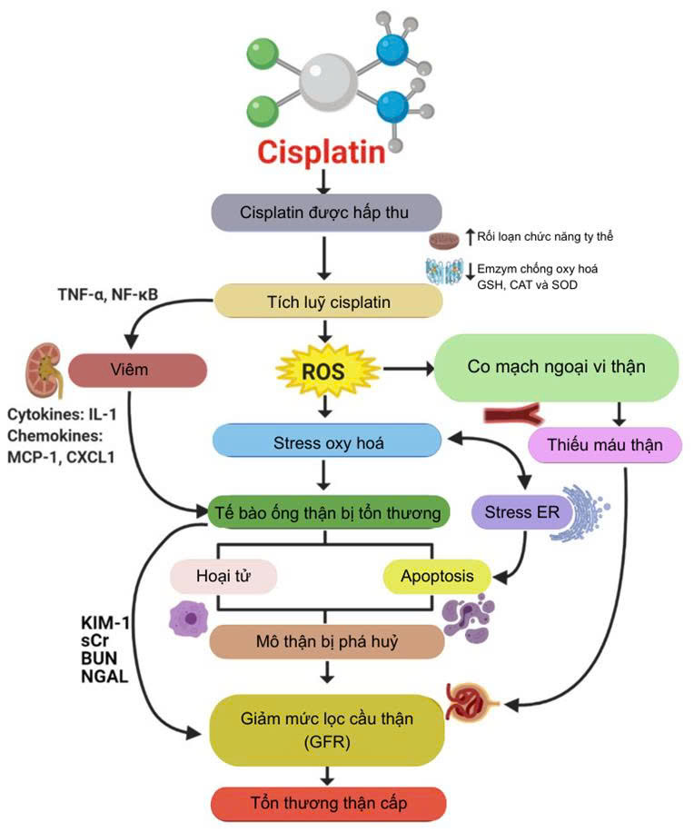 Các cơ chế phân tử chính liên quan đến các tác dụng phụ gây độc thận do cisplatin gây ra bao gồm sự hấp thu và tích tụ tế bào, viêm, stress oxy hóa, tổn thương mạch máu, stress lưới nội chất (ER), hoại tử và apoptosis (Hình 1). Rất nhiều tác nhân dược lý và các biến đổi di truyền đã được phân tích, đánh giá trong các nghiên cứu tiền lâm sàng thử nghiệm về suy thận cấp do cisplatin cho thấy sự tích lũy của cisplatin vào tế bào chính là khởi đầu của các tác động gây độc thận [1]. Sự tích lũy cisplatin kích hoạt sự gia tăng sản xuất yếu tố hoại tử khối u alpha (TNF-α) và các loại phản ứng oxy (ROS), kích thích tình trạng viêm, stress oxy hóa, tổn thương mạch máu và các con đường apoptosis. Các cơ chế apoptosis sau đó thúc đẩy tổn thương mô thận dẫn đến biểu hiện lâm sàng chính của độc tính thận (giảm tốc độ lọc cầu thận (GFR)) dẫn đến suy thận cấp [1], [6].