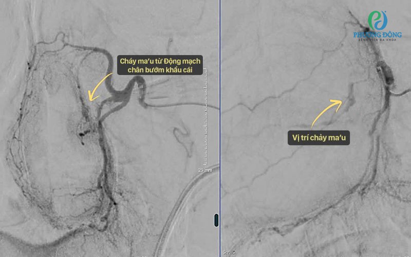 Tại Trung tâm Chẩn đoán hình ảnh và Điện quang can thiệp Quốc tế Phương Đông, bệnh nhân được chỉ định chụp mạch bằng hệ thống DSA (chụp mạch số hóa xóa nền). Kết quả cho thấy nguyên nhân xuất phát từ nhánh động mạch hàm trong - cụ thể là động mạch bướm khẩu cái, vị trí sâu và khó tiếp cận.