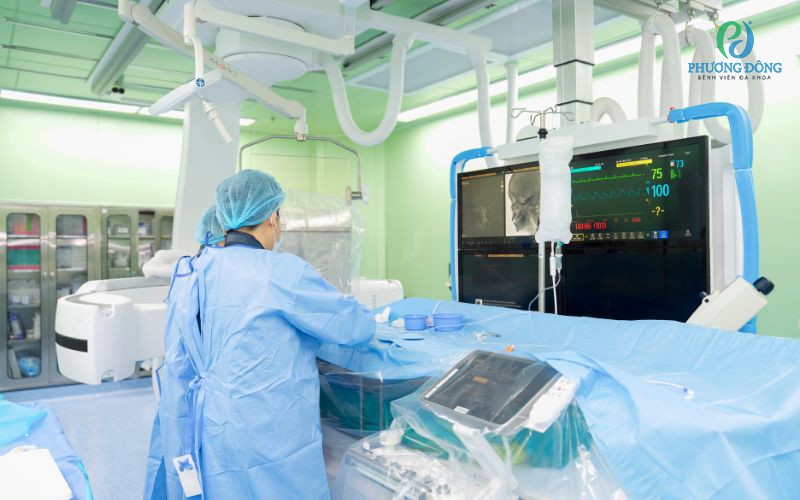 Thay vì can thiệp phẫu thuật lần hai, các bác sĩ đã lựa chọn phương pháp nút mạch - một kỹ thuật ít xâm lấn nhưng đem lại hiệu quả cao. Thông qua một ống thông siêu nhỏ, ekip can thiệp tiếp cận chính xác vị trí tổn thương và bơm vật liệu chuyên dụng để “khóa” dòng chảy.