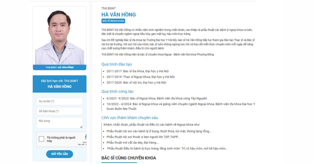 Tại Ngoại khoa - Bệnh viện Đa khoa Phương Đông, Thạc sĩ – Bác sĩ nội trú Ngoại khoa Hà Văn Hồng là một trong những gương mặt nổi bật. Sau khi tốt nghiệp Y Đa khoa, bác sĩ Hồng tiếp tục tham gia chương trình đào tạo Nội trú tại trường Đại học y Hà Nội. Hiện nay bác đã có nhiều năm kinh nghiệm trong chẩn đoán, can thiệp và phẫu thuật các bệnh lý, đặc biệt là chuyên ngành Ngoại tiêu hoá, Gan mật tuỵ, Hậu môn trực tràng.
