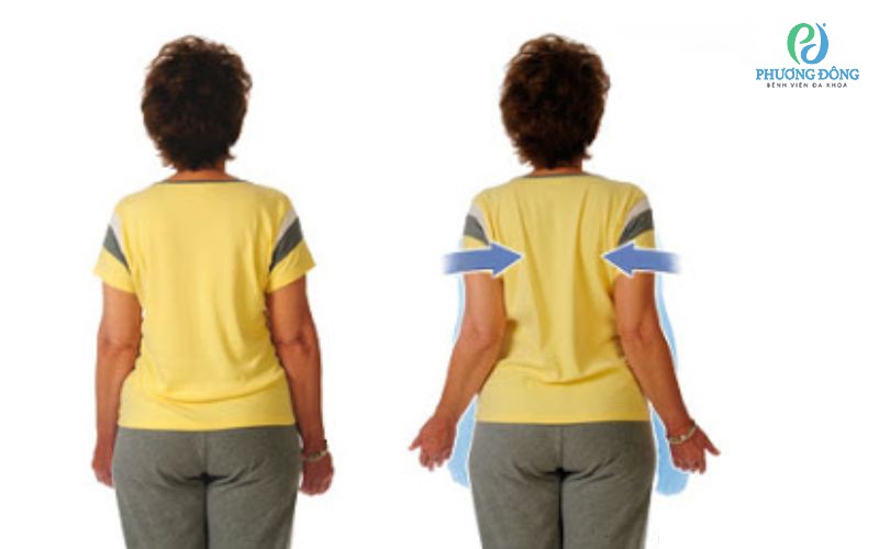 - Bước 2: Từ từ kéo hai bả vai về phía sau, kết hợp nâng lên và hạ xuống nhẹ nhàng trong khi vẫn giữ vai ép về sau.
