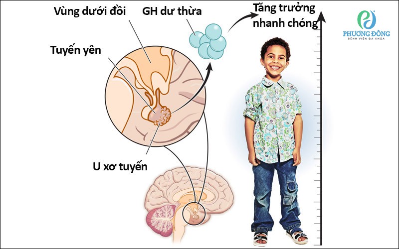 Ở trẻ em và thanh thiếu niên, khi các đĩa tăng trưởng của xương vẫn còn mở, việc dư thừa hormone tăng trưởng khiến xương dài ra bất thường, dẫn đến chiều cao vượt trội so với lứa tuổi – đây chính là đặc trưng của bệnh Gigantism. Người mắc có thể đạt chiều cao hơn 2 mét, kèm theo các biểu hiện như bàn tay, bàn chân to bất thường, khuôn mặt dài, hàm nhô, đau khớp hoặc nhức đầu do khối u tuyến yên.