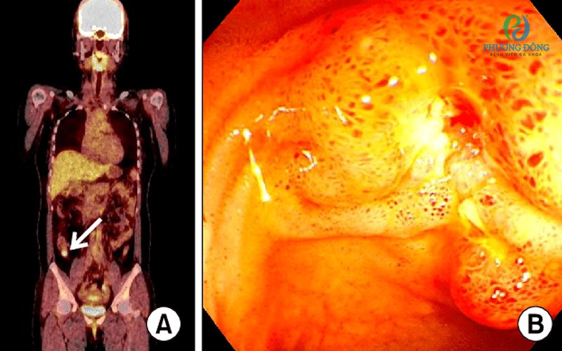 - Hình ảnh (B) là hình ảnh nội soi đại tràng. Có một vết loét hình bầu dục ở đoạn cuối hồi tràng. Kết quả xét nghiệm bệnh lý cuối cùng xác nhận chẩn đoán lao. PET-CT, chụp cắt lớp phát xạ positron; SUVmax, giá trị hấp thu chuẩn tối đa.