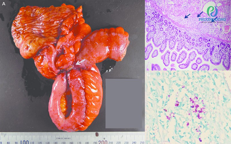 - (A) Đoạn cuối của hồi tràng đã cắt bỏ và một phần của đại tràng lên được hiển thị. Hồi tràng cuối vòng quanh và dính vào manh tràng. Có một lỗ thủng trên tổn thương loét hồi manh tràng (mũi tên). Xét nghiệm mô bệnh học cho thấy