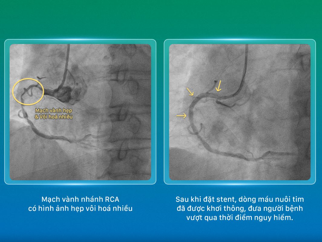 Sau những giây phút "cân não", ca can thiệp được thực hiện thành công nhờ chiến lược xử trí phù hợp, kinh nghiệm của ê-kíp chuyên gia và sự hỗ trợ của công nghệ hiện đại. Việc đặt stent chính xác đã giúp khơi thông dòng máu nuôi tim, đưa người bệnh vượt qua thời điểm nguy hiểm.