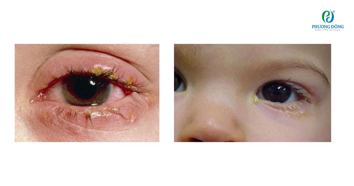 - Mi mắt sưng nề nhiều, tiết dịch dày, có dịch hồng như máu
