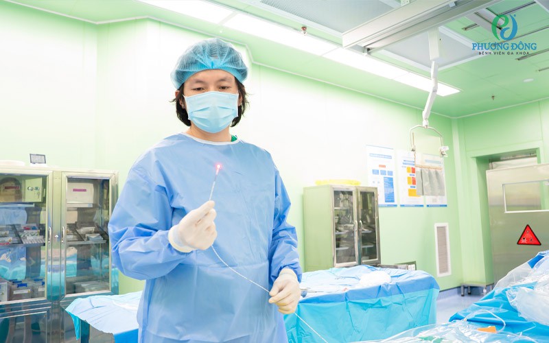 ThS.BS Đoàn Dư Mạnh - Phó Giám đốc Trung tâm Tim mạch và Đột quỵ Quốc tế Phương Đông, đã sử dụng thiết bị chuyên dụng tác động trực tiếp vào tĩnh mạch bị suy, “đóng” dòng trào ngược một cách chính xác.