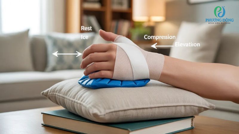 - Nghỉ ngơi (Rest): Bệnh nhân cần hạn chế vận động cổ tay vài ngày sau chấn thương, đảm bảo cơ và dây chằng có thêm thời gian hồi phục.