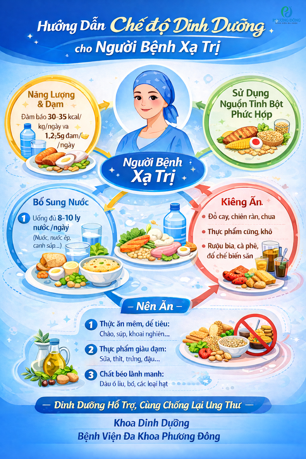 Chế độ dinh dưỡng ảnh hưởng rất lớn đến quá trình xạ trị. Duy trì một chế độ dinh dưỡng khoa học giúp hỗ trợ cơ thể và hệ thống miễn dịch của người bệnh chống lại tế bào ung thư.