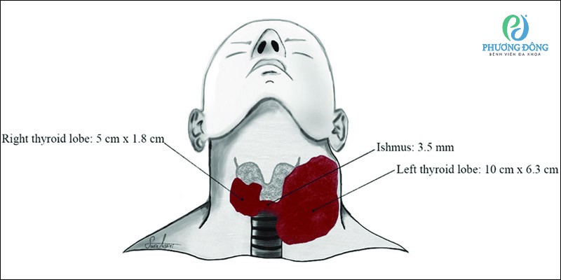 Hình minh họa thể hiện kích thước của tuyến giáp, làm nổi bật sự khác biệt lớn về kích thước giữa thùy giáp phải và thùy giáp trái