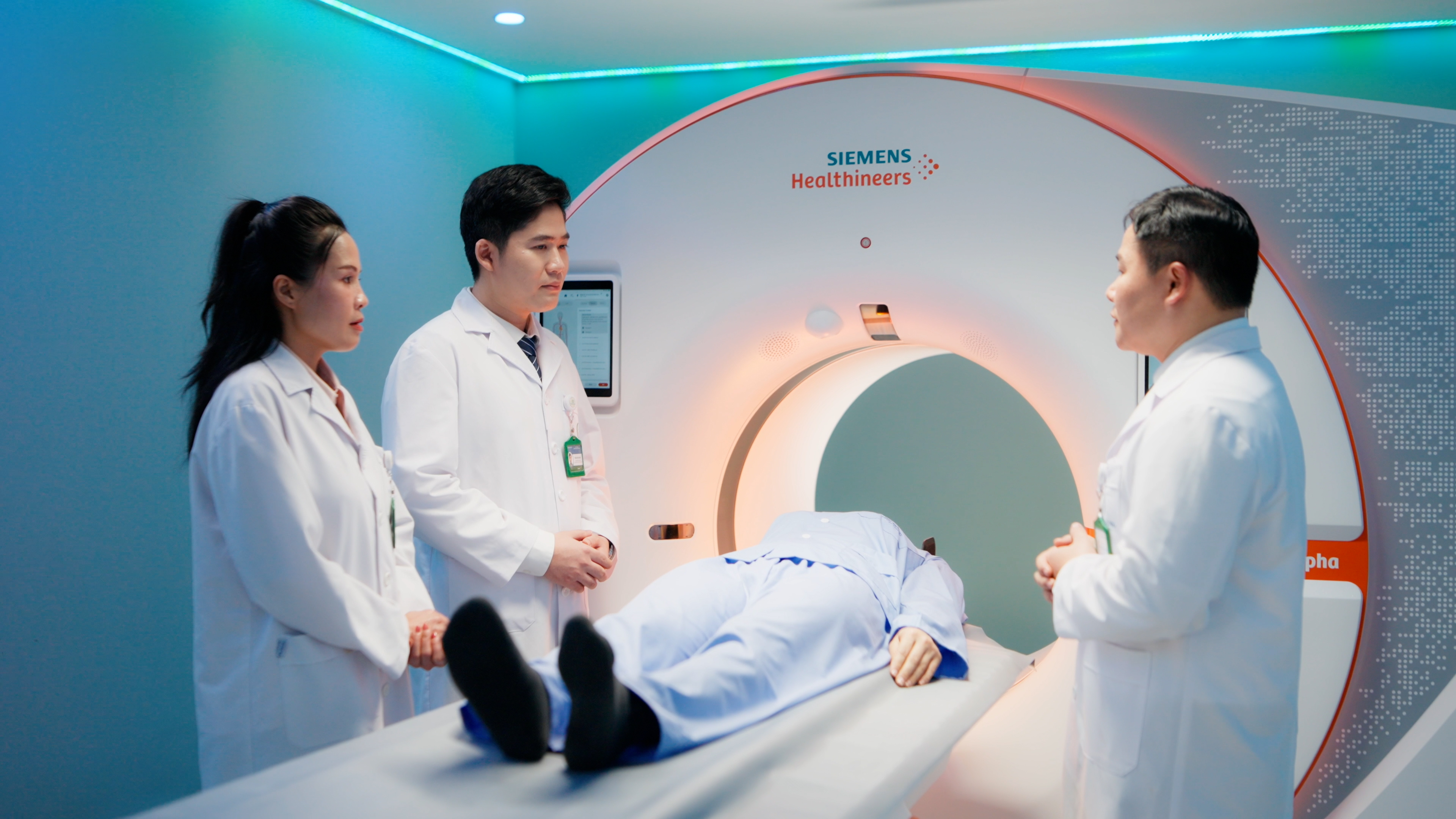 Bàn chụp di chuyển vào trong máy CT, máy sẽ quét nhanh vùng tim để thu nhận dữ liệu hình ảnh.
