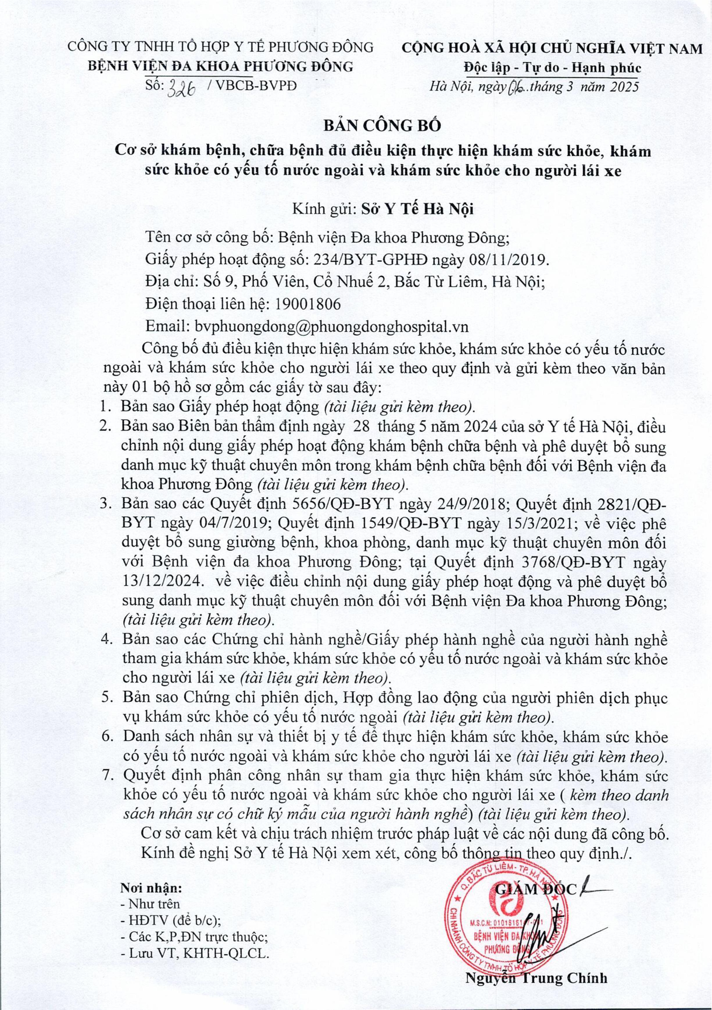 Tên cơ sở công bố: Bệnh viện Đa khoa Phương Đông