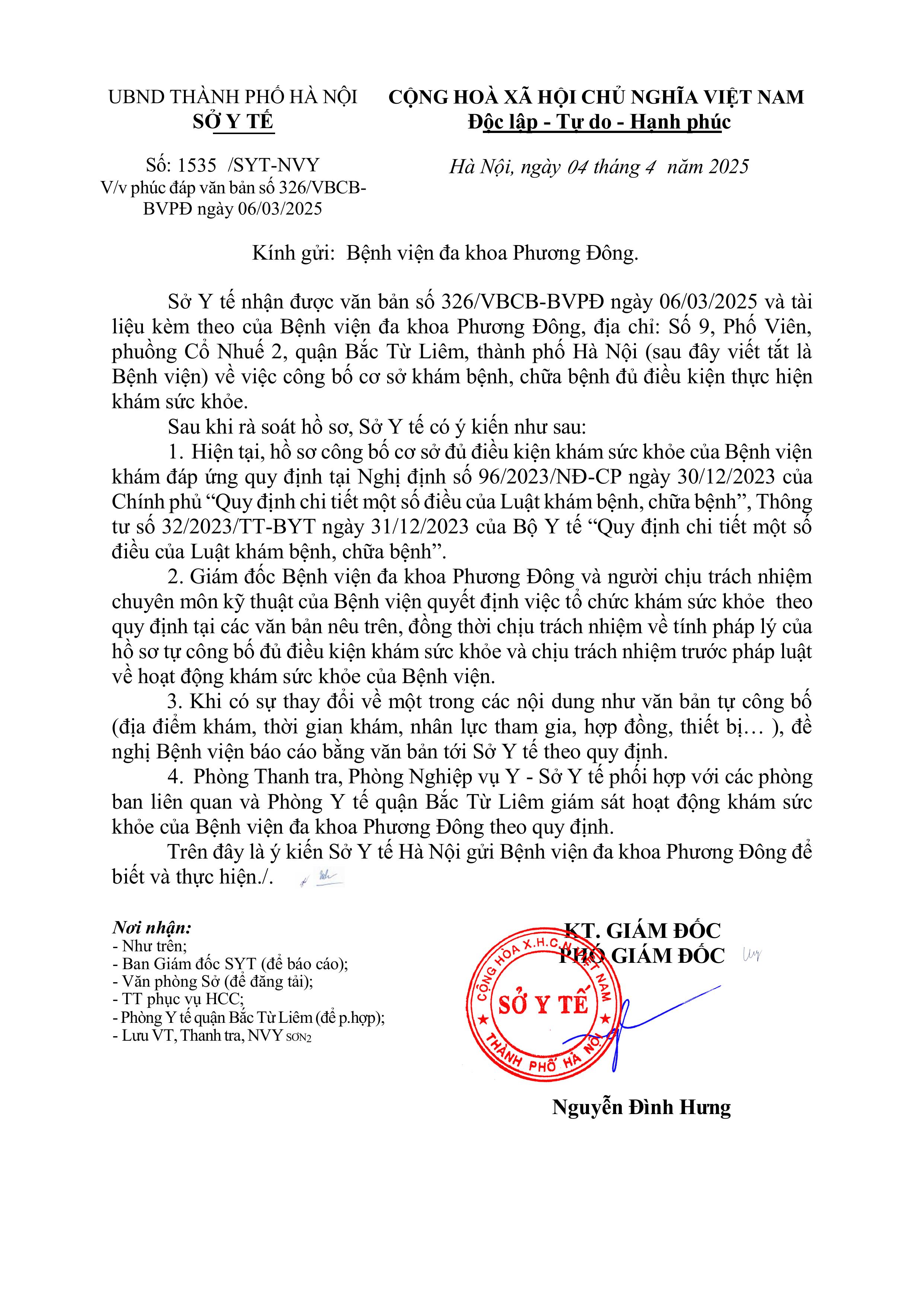 Trên đây là ý kiến của Sở Y tế Hà Nội gửi Bệnh viện Đa khoa Phương Đông để biết và thực hiện./.