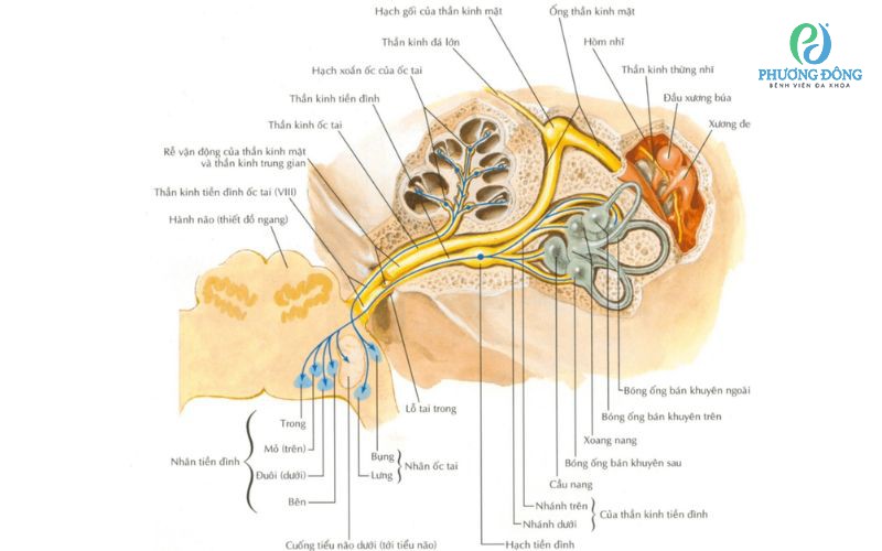 • Dây thần kinh số 8: Bao gồm hai thành phần là dây tiền đình và dây ốc tai. Hai phần này hợp lại tại lỗ thính giác trong và cùng đi vào não, đảm nhiệm chức năng thăng bằng và thính giác.