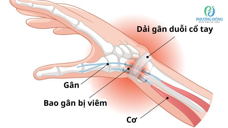 Lạm dụng cổ tay trong thời gian dài, thực hiện lặp đi lặp lại một động tác tay có thể khiến lớp bao quanh gân bị kích thích. Khi lớp bao này bị viêm, các gân có thể dày và sưng lên, làm hạn chế khả năng trượt lên trượt xuống trong ống mô sợi.