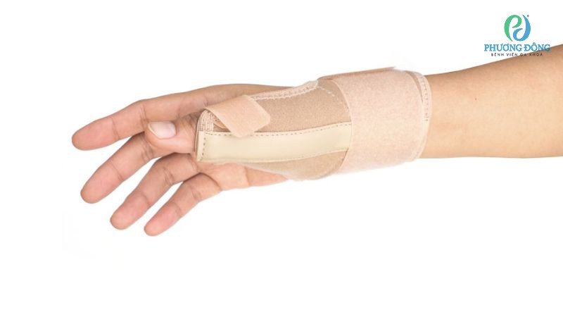 - Bất động ngón cái và cổ tay bằng nẹp hoặc băng cố định để gân nghỉ ngơi.