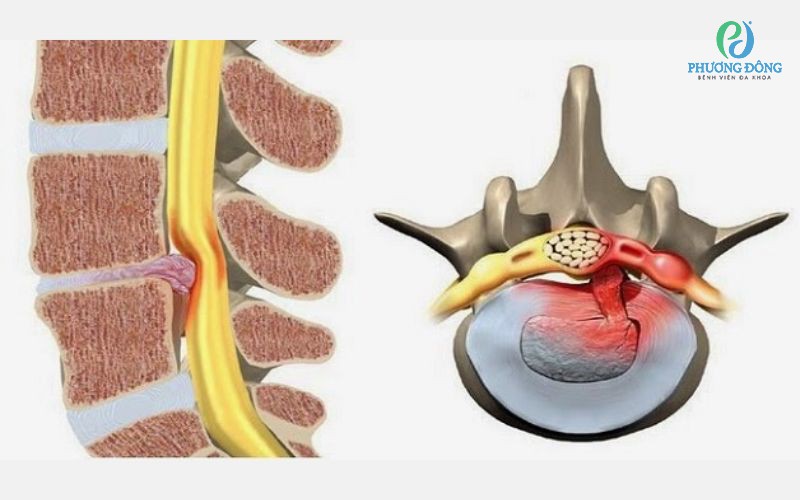 - Thoát vị đĩa đệm: Khi nhân tủy thoát ra khỏi vòng sợi và lồi về phía ống sống, áp lực lên tủy sống sẽ gia tăng