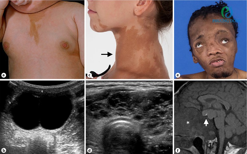 - C) Trẻ vị thành niên có vết bớt màu cà phê sữa điển hình ảnh hưởng đến cổ và hàm, và bướu cổ (mũi tên) phù hợp