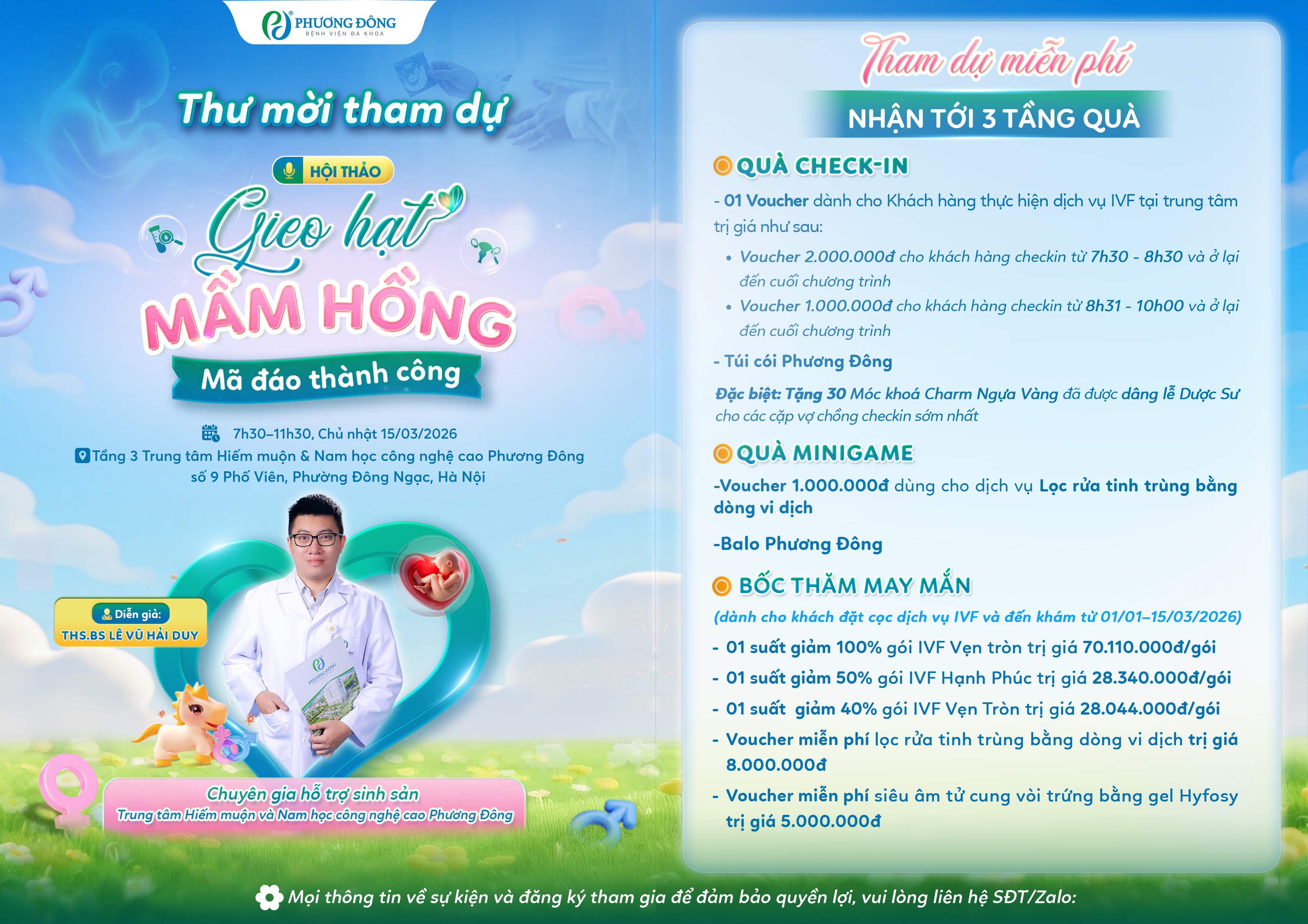Trong khuôn khổ hội thảo hỗ trợ sinh sản “Gieo hạt mầm hồng - Mã đáo thành công” diễn ra từ 7h30 đến 11h30 sáng Chủ Nhật ngày 15/03 tại Bệnh viện Đa khoa Phương Đông, ba mẹ sẽ được trực tiếp lắng nghe phần chia sẻ chuyên sâu từ ThS Mô phôi, BS CKI Sản phụ khoa Lê Vũ Hải Duy.