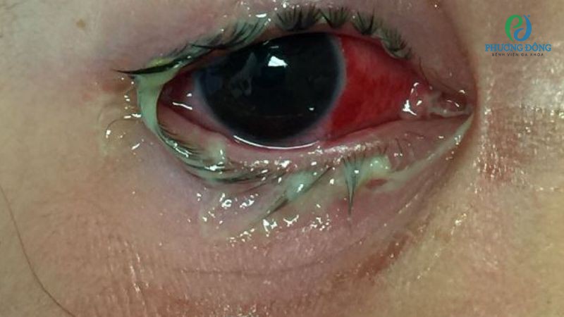 - Dịch tiết chảy từ mắt ở dạng mủ, kèm mùi khó chịu với những trường hợp nặng.
