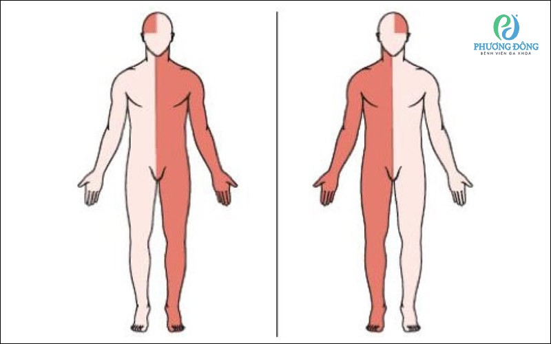 Ghi chú: Hình bên trái mô tả tổn thương não ở phần não trái (tất cả các bộ phận cơ thể bị ảnh hưởng được đánh dấu bằng màu đỏ), gây liệt nửa người bên phải. Hình bên phải mô tả tổn thương não ở phần não phải, gây liệt nửa người bên phải.