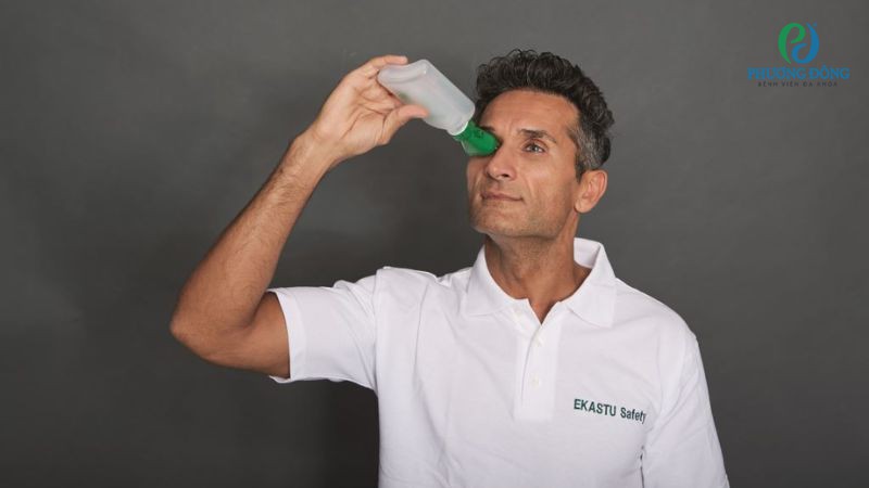 Sử dụng nước rửa mắt để cân bằng độ ẩm và loại bỏ dị vật (nếu có)