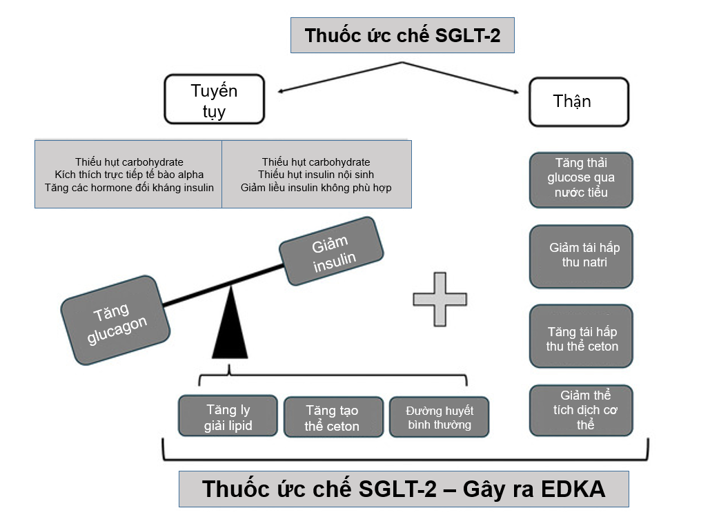 Thuốc ức chế SGLT-2 gây EDKA bằng nhiều cơ chế và có thể tóm tắt như sau: