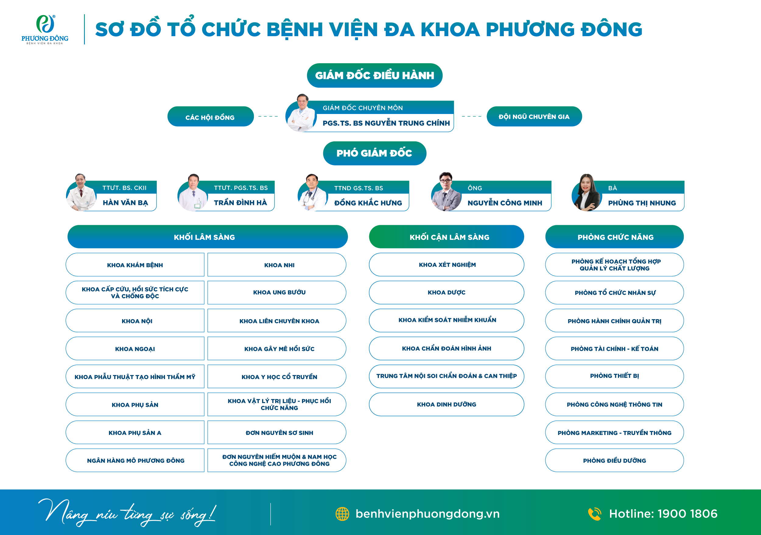 Sơ đồ tổ chức bộ máy Bệnh viện Đa khoa Phương Đông bao gồm các đơn vị sau: