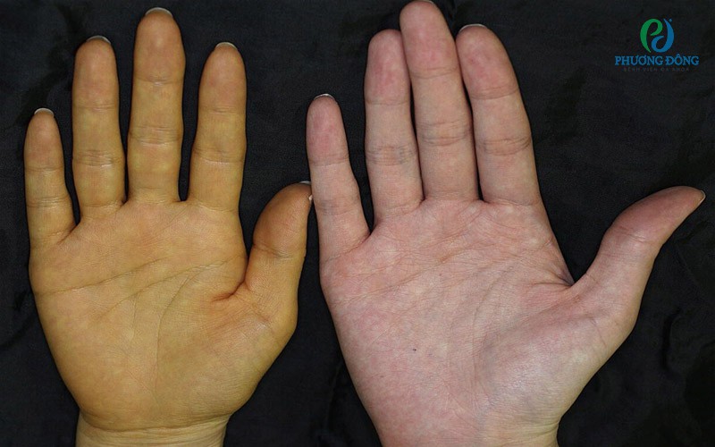 Ở người bị tăng caroten máu, dấu hiệu dễ nhận thấy nhất là da chuyển sang màu vàng nhạt, thường xuất hiện rõ tại rãnh mũi – má, lòng bàn tay và lòng bàn chân. Màu vàng này thường đồng đều, không kèm theo ngứa hay khó chịu.