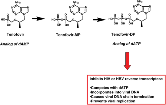 Tenofovir là một chất tương tự nucleotide (NA) của adenosine 5′-monophosphate. Ở dạng gốc, tenofovir là một dianion ở pH sinh lý và có tính thấm màng tế bào kém và sinh khả dụng đường uống thấp. Tenofovir sau đó được hoạt hóa thành tenofovir-diphosphate trong tế bào[1]. Tenofovir-diphosphate (DP) cạnh tranh với deoxyadenosine -triphosphate (dATP) một tiền chất tự nhiên của DNA để gắn vào DNA virus, một khi được gắn vào, tenofovir ngăn cản chuỗi DNA HBV kéo dài thêm vì cấu trúc của tenofovir khiến việc gắn các nucleotide tiếp theo vào DNA virus đang phát triển trở nên bất khả thi về mặt hóa học gây kết thúc chuỗi DNA, ngăn virus nhân lên[2].