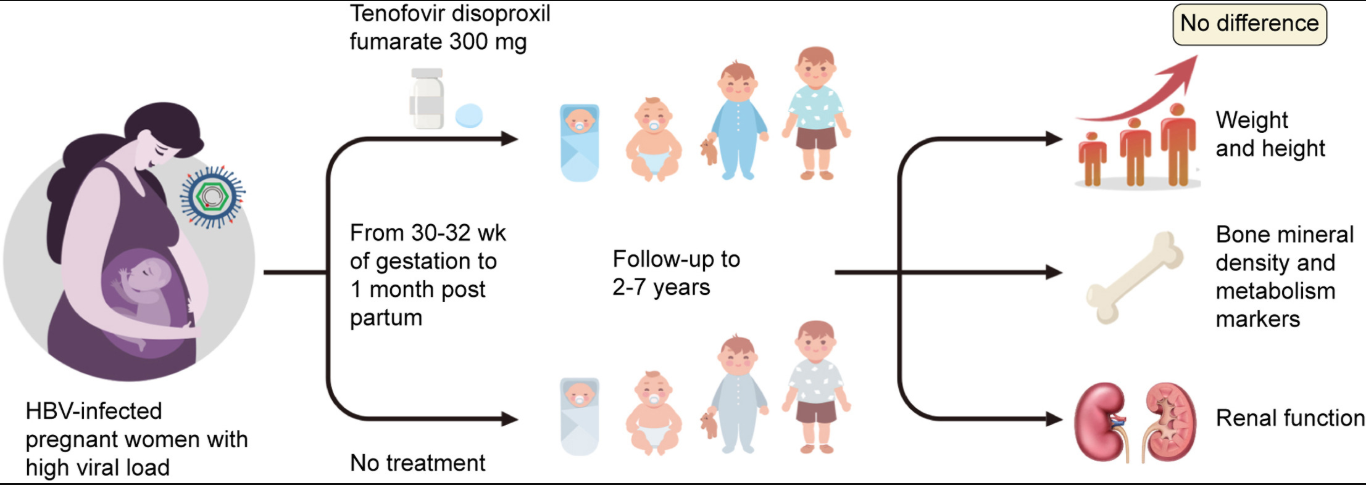 TDF là phương pháp điều trị ưu tiên để ngăn ngừa lây truyền HBV từ mẹ sang con nhờ hiệu quả và độ an toàn. Tuy nhiên, vẫn còn thiếu dữ liệu về kết quả an toàn lâu dài ở trẻ em sau khi thai nhi tiếp xúc với TDF. Nhóm nghiên cứu của Đài Loan về phòng ngừa lây truyền HBV từ mẹ sang con đã đánh giá về sự phát triển xương và sự tăng trưởng lâu dài ở những trẻ em có bà mẹ dùng TDF điều trị HBV mãn tính. Tổng cộng có 128 trẻ tham gia nghiên cứu trong đó 71 trẻ trong nhóm TDF và 57 trẻ trong nhóm đối chứng, đã hoàn thành 255 lần tái khám ở độ tuổi từ 2 đến 7[13].