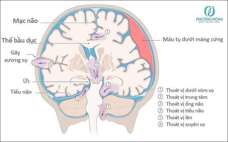 Thoát vị não được phân loại dựa trên vị trí mô não bị đẩy lệch khỏi vị trí giải phẫu bình thường. Trên lâm sàng, hiện ghi nhận 6 dạng thoát vị não thường gặp, mỗi loại có cơ chế hình thành và mức độ nguy hiểm khác nhau.