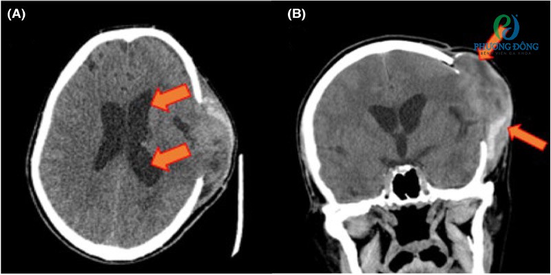 Hình ảnh chụp cắt lớp vi tính (CT) não theo mặt phẳng trục (A) và mặt phẳng vành (B) cho thấy tình trạng não úng thủy và thoát vị não qua lỗ hổng sau phẫu thuật mở sọ.