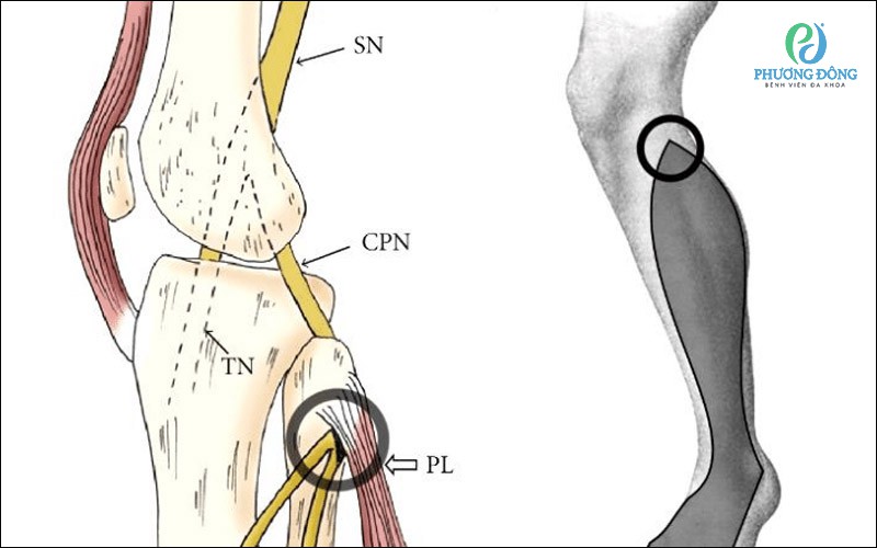 Ghi chú: Bên trái - chèn ép dây thần kinh mác chung (CPN) tại đường hầm mác (vòng tròn) cơ mác dài (PL) gần cổ xương mác (vòng tròn). Bên phải - phân bố cảm giác của chèn ép dây thần kinh mác chung. Các nhãn khác là SN, dây thần kinh tọa; TN, dây thần kinh chày.