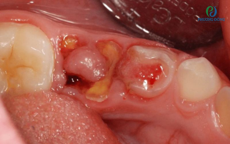 Khi bệnh tiến triển, niêm mạc bao phủ khối u dần trở nên mỏng, dễ bị thủng, tạo thành các lỗ dò thông ra khoang miệng hoặc bên ngoài da. Lúc này, người bệnh có thể xuất hiện hiện tượng chảy dịch hoặc đau nhẹ tại vị trí tổn thương.