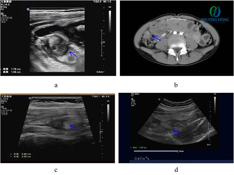 - (c, d) Ở trẻ em bị viêm túi thừa manh tràng phức tạp, siêu âm chẩn đoán nhầm là viêm ruột thừa cấp.